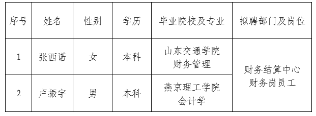 依据出资人代表机构审批意见,FH网页版_FH(中国)委托第三方机构面向社会公开招聘财务岗员工2人。现对拟录用人员信息进行公示,公示期间如有异议,可通过电话、信函等方式反映,反映意见请署真实姓名。