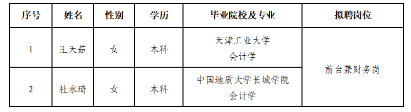 因公司发展需要,承德市建设投资有限责任公司委托第三方机构面向社会公开招聘前台兼财务岗员工。现对拟录用人员信息进行公示,公示期间如有异议,可通过电话、信函等方式反映,反映意见请署真实姓名。