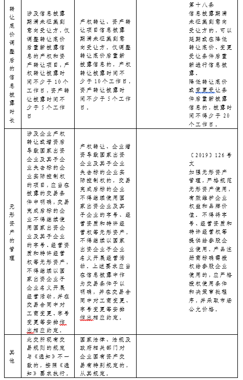 八、产权转让、资产转让项目信息披露期满未征集到意向受让方,仅调整转让底价后重新披露信息的,产权转让披露时间不少于10个工作日,资产转让披露时间不少于5个工作日。(与32号文相应规定相比,缩短了信息披露的时间,提升了效率)